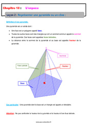 Cours sur « Représenter une pyramide ou un cône » pour la Secondaire 2 . Notions sur « L’espace » Définition d’une pyramide. Une pyramide est un solide dont : • Une face est un polygone appelé base. • Toutes les autres faces sont des triangles qui ont un sommet commun appelé le sommet de la pyramide. Ces faces sont appelées faces latérales. • La distance entre le sommet de la pyramide et sa base est appelée hauteur de la pyramide. Cas particulier : Une pyramide dont la…