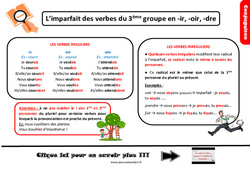 Trace écrite, leçon à imprimer niveau : Primaire 5 sur l’imparfait des verbes du 3ème groupe en -ir, -oir, -dre LES VERBES REGULIERS -ir Ex : courir -oir Ex : vouloir -dre Ex : attendre Je courais Je voulais J’attendais Tu courais Tu voulais Tu attendais Il/elle/on courait Il/elle/on voulait Il/elle/on attendait Nous courions Nous voulions Nous attendions Vous couriez Vous vouliez Vous attendiez Ils/elles couraient Ils/elles voulaient Ils/elles attendaient LES VERBES IRREGULIERS Quelques verbes irréguliers modifient leur radical à…