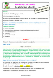 Étude de la langue en Primaire 3 : « Le pluriel des adjectifs » à l’aide de sa fiche de préparation. Objectifs : Identifier le pluriel d’un groupe nominal. Construire le pluriel des adjectifs. Connaître les pluriels des adjectifs finissant par s, x ; par -eau ; par -al (+ quelques exceptions). Accorder en nombre l’adjectif du nom. Prérequis : Savoir identifier un adjectif. Connaitre les notions de singulier/pluriel. Savoir ce qu’est un groupe nominal. Contenu de la séquence : Fiche de…