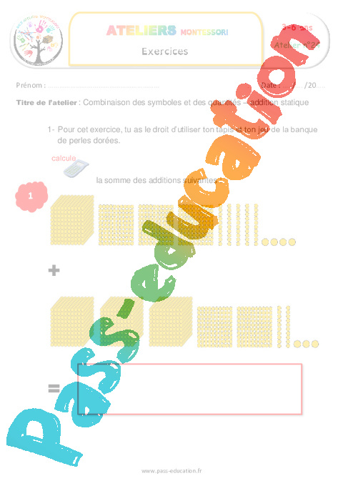 Addition statique-Montessori 24-Exercices et bonus-Corrections pdf