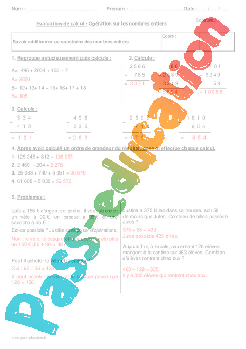 Correction – Additionner ou soustraire des nombres entiers : Primaire 5 – Bilan avec le corrigé pdf