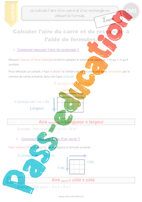 Je calcule l’aire d’un carré et d’un rectangle en utilisant la formule.: Primaire 4 -Leçon pdf