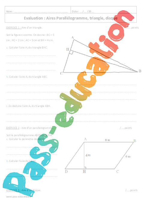Aires : Secondaire 1 – Contrôle – Parallélogramme, triangle, disque pdf