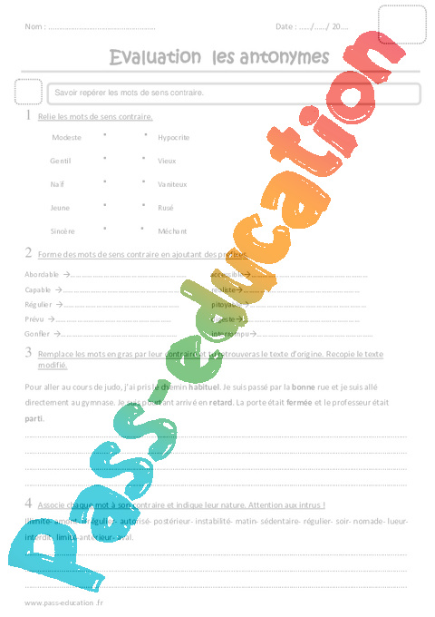 : Primaire 5 – Evaluation – Bilan les antonymes / Les mots de sens contraire