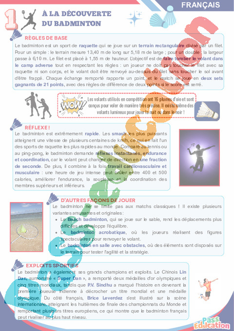 Cahier de vacances à imprimer : Badminton