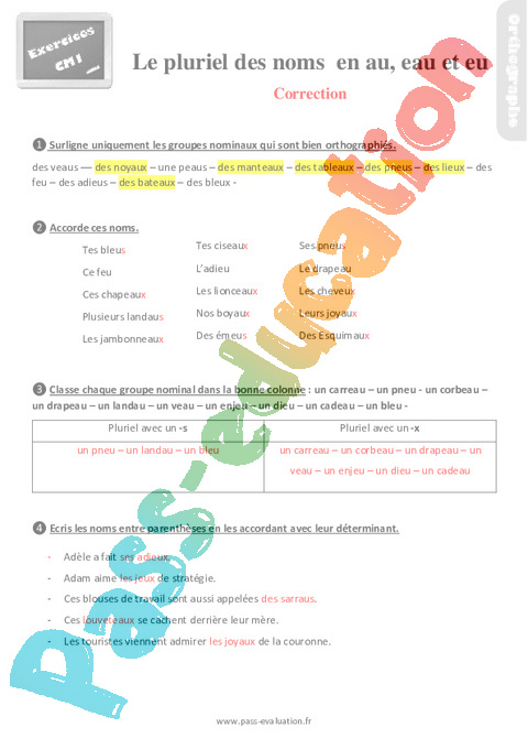 Exercices Correction : Primaire 4 – Pluriel des noms en eau, au et eu pdf