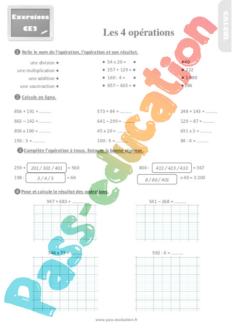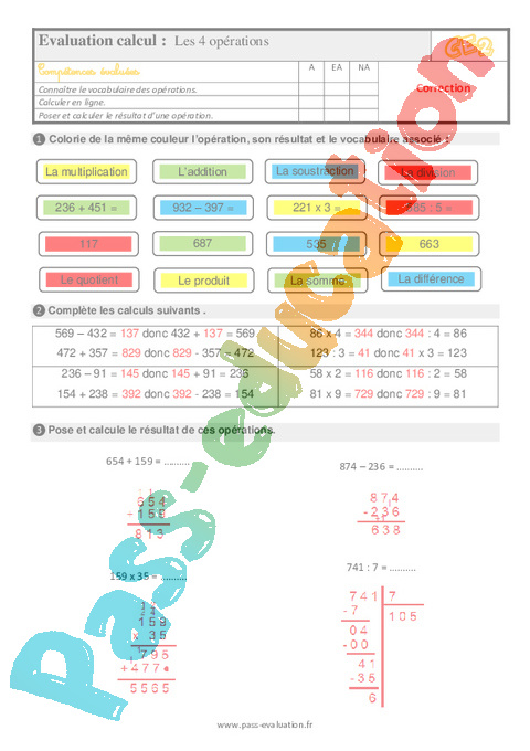 Evaluation : Primaire 3 sur les 4 opérations pdf