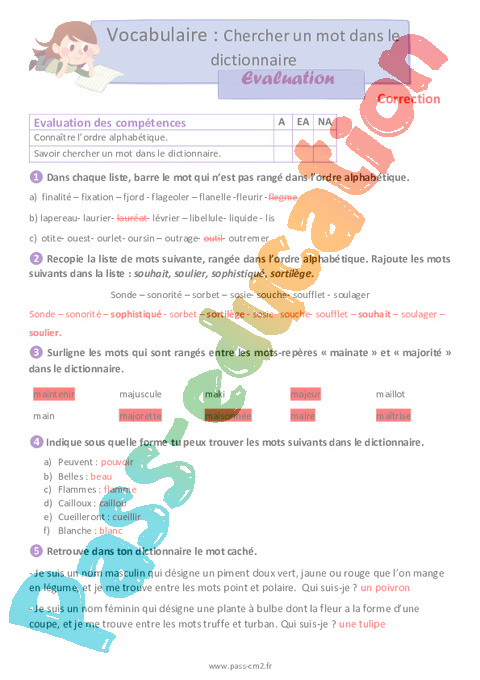 Correction Evaluation : Primaire 5 Chercher un mot dans le dictionnaire pdf
