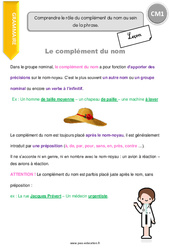 Trace écrite, leçon à imprimer niveau : Primaire 4 sur le complément du nom complément du nom sert à compléter un nom, c’est-à-dire à donner plus d’informations sur celui-ci. Il fait donc partie du groupe nominal. Ex : Elle porte un chapeau de paille. Il ne s’accorde ni en genre ni en nombre avec le nom principal. Le complément du nom peut être un autre nom. Ex : Elle tricote un pull en laine. C’est le pull de Max. Le…