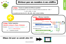Leçon de mathématiques, calcul : Primaire 4, 5 : La division à 1 chiffre au diviseur CAL 9 : La division : 1 chiffre au diviseur POUR EFFECTUER UNE DIVISION, IL FAUT RESPECTER 3 ÉTAPES : Exemple: “ 4 358 divisé par 7” Voir les fiches