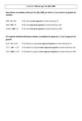 Leçon de mathématiques, calcul : Primaire 4, 5 : diviser par 10, 100, 1000 CAL 11 : Diviser par 10, 100, 1000 Pour diviser un nombre entier par 10, 100, 1000, on retire 1, 2 ou 3 zéros à la gauche du nombre. 6500 : 10 = 650 à On retire un zéro à gauche du nombre divisé par 10 6500 : 100 = 65 à On retire deux zéros à gauche du nombre divisé par 100 24 000 :…