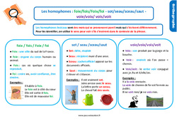 Leçon, trace écrite sur les homophones lexicaux: foie/fois/Foix/foi – sot/seau/sceau/saut – voie/voix/ vois/voit en Primaire 4 Les homophones lexicaux sont des mots qui se prononcent pareil mais qui s’écrivent différemment. Pour les identifier, on utilise le sens pour voir s’ils s’insèrent dans le contexte de la phrase. foie / fois / Foix / foi Foix : une ville du sud de la France. Foie : organe du corps humain ou animal. Fois : cas où quelque chose se reproduit. Foi…
