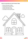 Listen to the instructions and color the house in below.The roof of the house is orange.The chimney of the house is brown.The door of the house is blue.The wall of the house is purple.The windows of the house are yellow.