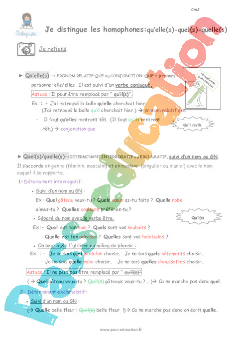 Leçon Comment distinguer les homophones qu’elle(s)-quel(s)-quelle(s): Primaire 5 pdf