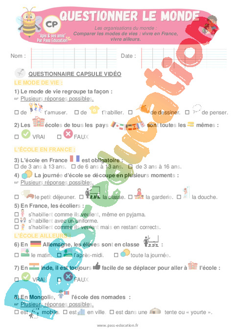 3 QCM caspule vidéo Comparer les modes de vies vivre en France, vivre ailleurs : Primaire 1 pdf
