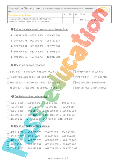 Evaluation Numération : Comparer, ranger les nombres inférieurs à 1 000 000 000.