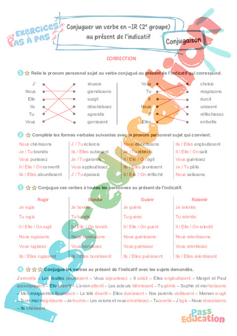 Correction Conjuguer un verbe en -ir au présent de l’indicatif : Primaire 3 – Exercices Pas à Pas rtf