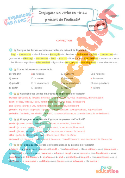Correction Conjuguer un verbe en -ir au présent de l’indicatif : Primaire 5 – Exercices Pas à Pas rtf