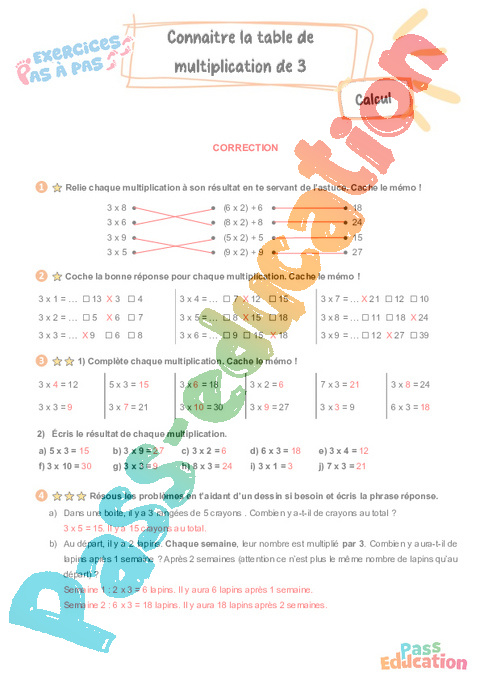 Correction Connaître la table de multiplication par 3 : Primaire 3 – Exercices Pas à Pas rtf