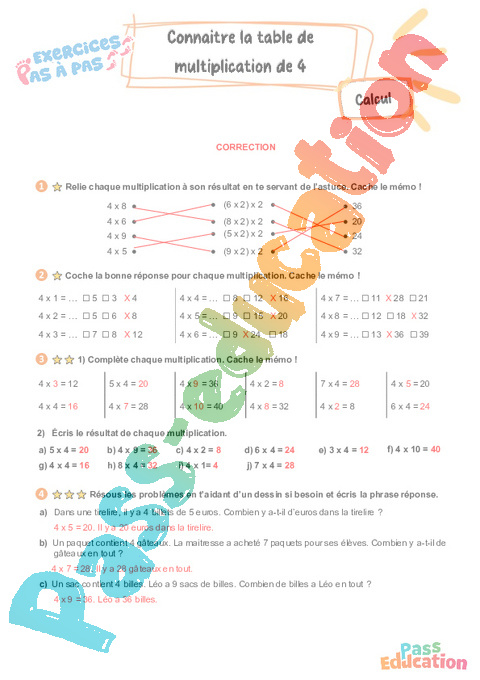 Correction Connaître la table de multiplication par 4 : Primaire 3 – Exercices Pas à Pas pdf