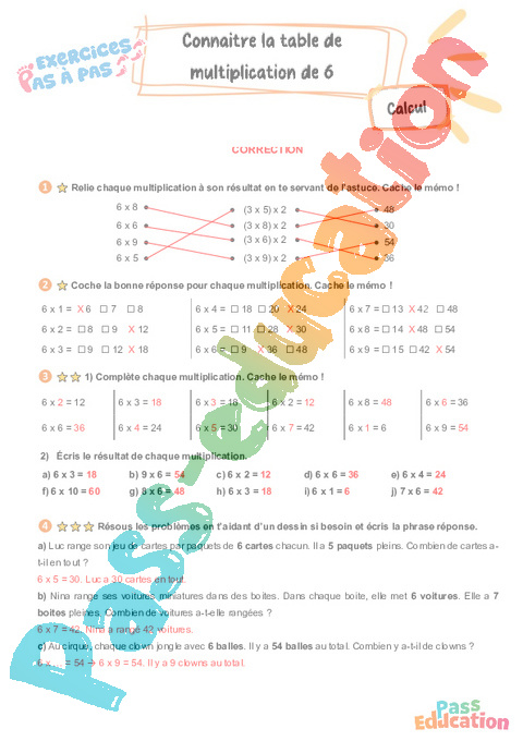 Correction Connaître la table de multiplication par 6 : Primaire 3 – Exercices Pas à Pas rtf