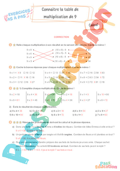 Correction Connaître la table de multiplication par 9 : Primaire 3 – Exercices Pas à Pas pdf