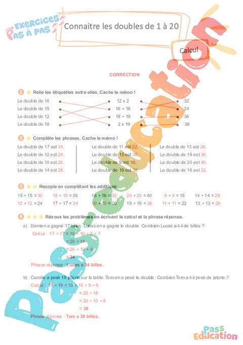 Correction Connaitre les doubles de 1 à 20 : Primaire 3 – Exercices Pas à Pas rtf