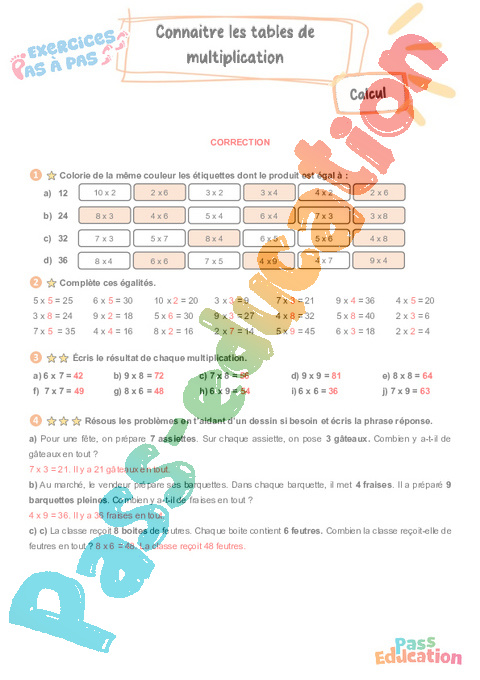 Correction Connaitre les tables de multiplication : Primaire 3 – Exercices Pas à Pas rtf