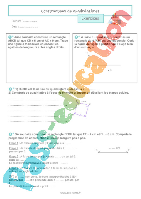 Exercices en géométrie avec la correction sur les constructions de quadrilatères en 6ème.