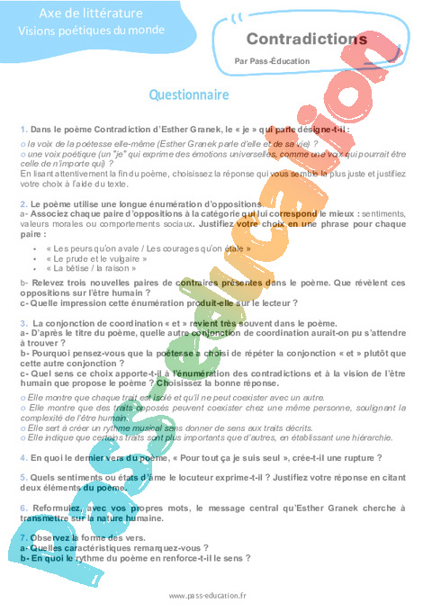 Questionnaire Contradictions (Esther Granek) : Secondaire 3 pdf