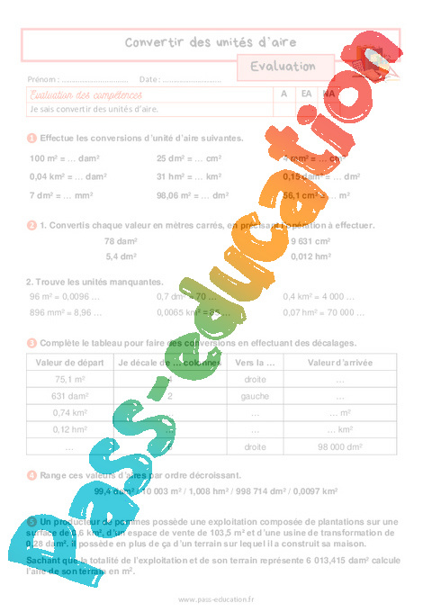 - Evaluation avec la correction pour la Secondaire 1 sur convertir des des unités d’aire.