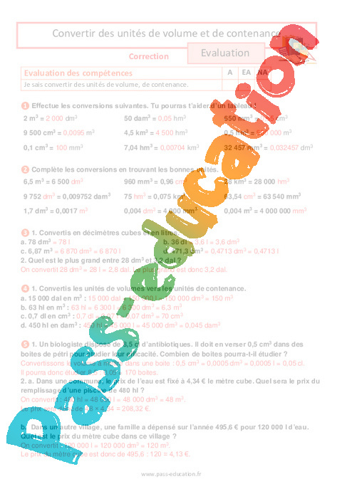- Evaluation avec la correction pour la Secondaire 1 sur convertir des unités de volume et de contenance.
