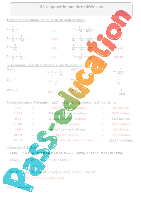 : Primaire 5 – Exercices avec correction – Décomposer les nombres décimaux –