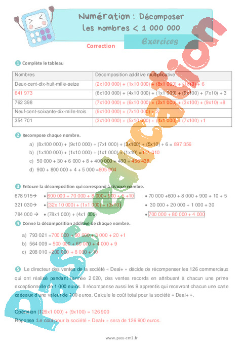 Exercices Correction : Primaire 4 Décomposer les nombres inférieur à 1 000 000 pdf