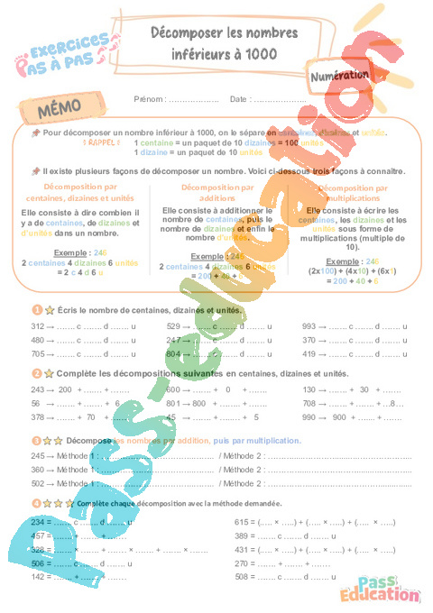 Décomposer les nombres inférieurs à 1000 : Primaire 3 – Exercices Pas à Pas rtf