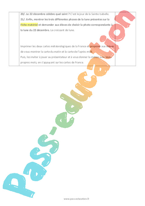 21/. Enfin, montrer les trois différentes phases de la lune présentes sur la Fiche matériel et demander aux élèves de choisir la photo correspondante à la lune du 22 décembre. Le croissant de lune.