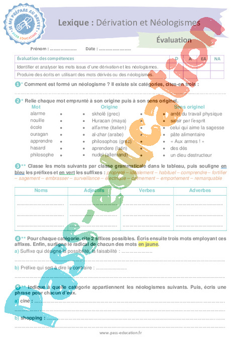 Evaluation Dérivation et Néologismes : Secondaire 3 – Je me prépare au Brevet pdf