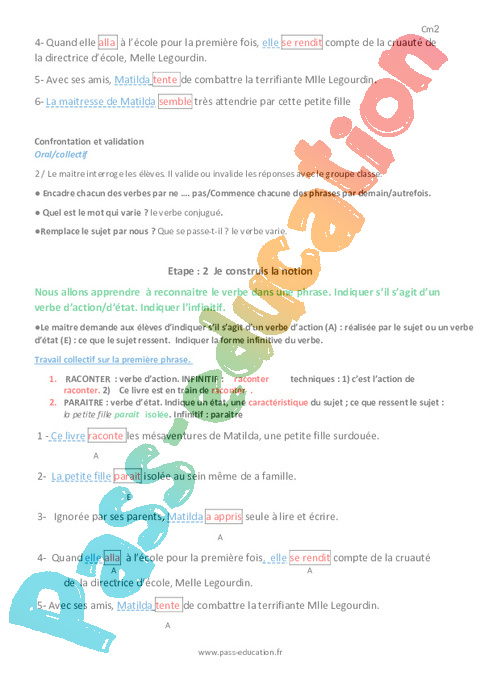 Nous allons entrainer les élèves à repérer le verbe. (ainsi que le sujet du verbe). Indiquer si verbe d’action ou verbe d’état et les différentes formes du verbe : infinitif, forme simple, forme composée.