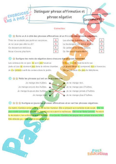 Exercices Pas à Pas avec mémo / leçon de grammaire pour travailler la compétence : distinguer phrase affirmative et phrase négative au : Primaire 3 .
