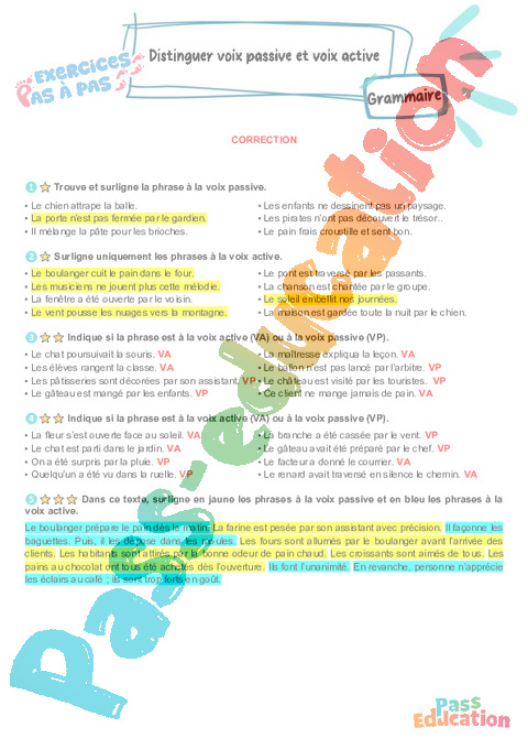 Correction Distinguer voix passive et voix active : Primaire 5 – Exercices Pas à Pas rtf