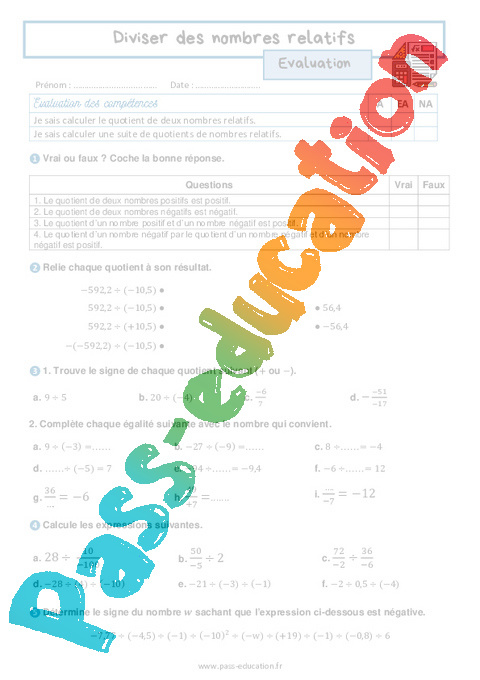 Evaluation : Secondaire 2 Diviser des nombres relatifs pdf