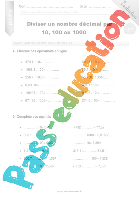 Diviser un nombre décimal par 10,100 ou 1000 : Primaire 5 -Evaluation-Bilan-Correction pdf