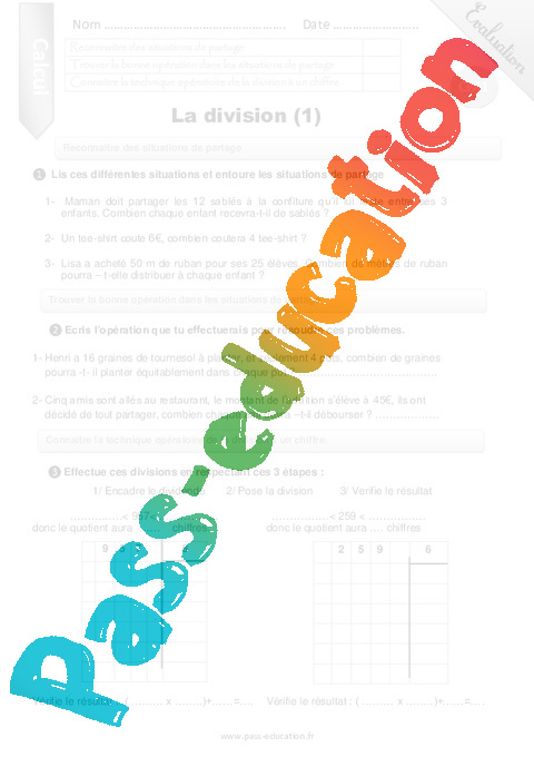 Division (sens et division à un chiffre) - Evaluation-Bilan : Primaire 4