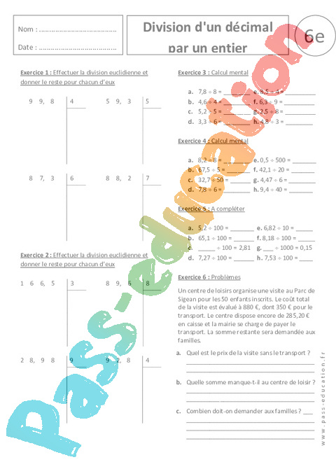 Exercices à imprimer pour la Primaire 6  – Division d’un décimal par un entier