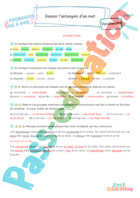 Correction Donner l’antonyme d’un mot : Primaire 5 – Exercices Pas à Pas pdf
