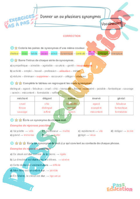 Donner un ou plusieurs synonymes : Primaire 5 – Exercices Pas à Pas rtf