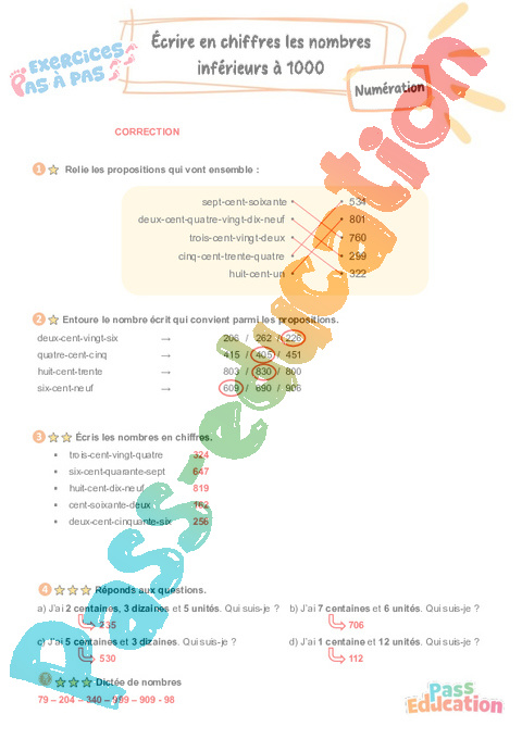 Correction Écrire en chiffres les nombres inférieurs à 1000 : Primaire 3 – Exercices Pas à Pas rtf