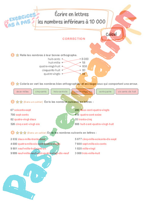 Correction Écrire en lettres les nombres inférieurs à 10 000 : Primaire 3 – Exercices Pas à Pas rtf