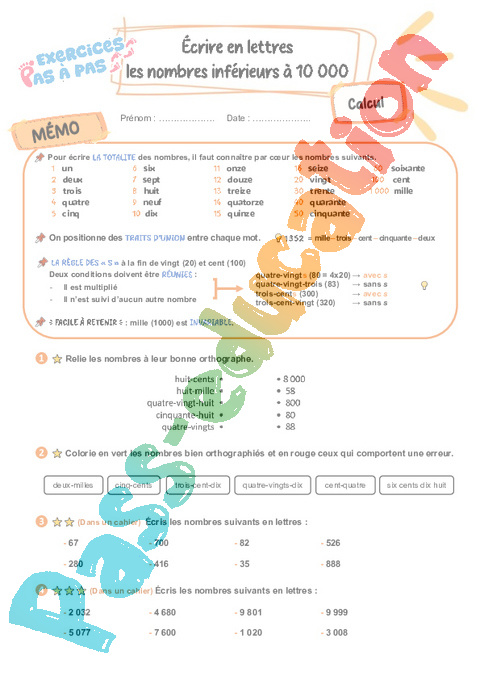Écrire en lettres les nombres inférieurs à 10 000 : Primaire 3 – Exercices Pas à Pas rtf