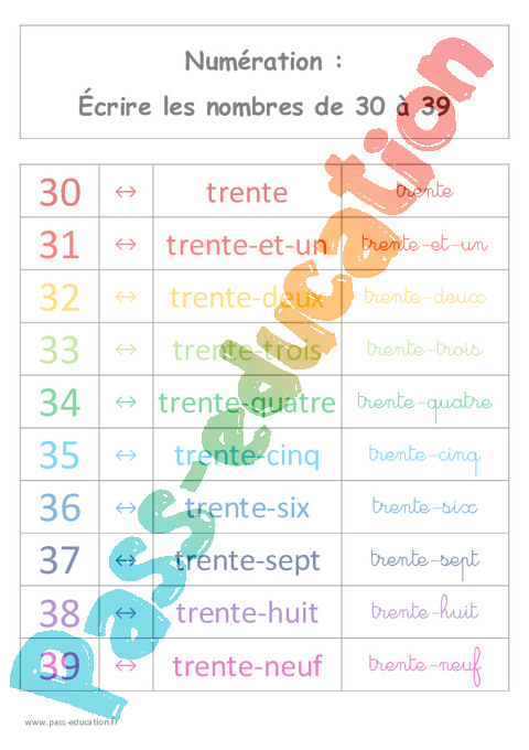 Ecrire les nombres de 30 à 39 – Affiche pour la classe : Primaire 1 – PDF à imprimer